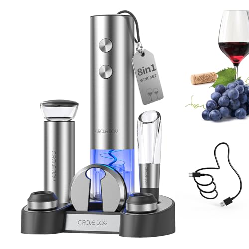 {"about_product": ["ONE-TOUCH EFFORTLESS OPENING - Simply place it on the bottle, press the \"Down\" button, and the cork is automatically removed in 8 seconds. Press the \"Up\" button to release the cork quickly. No more broken, difficult, or unsafe corks—enjoy smooth cork removal every time. The transparent window with blue LED lighting provides a clear view of the process, making it easy to open standard wine bottles effortlessly", "LONG-LASTING & RECHARGEABLE - Powered by a robust built-in battery. Easily recharge your electric opener using the included USB-C cable; a single charge opens up to 100 bottles. Its efficient and elegant design neatly stores all accessories, keeping it ready for use anytime. A stylish addition to any home bar or kitchen countertop", "EFFORTLESS & ELEGANT WINE EXPERIENCE - This complete electric opener set includes an automatic corkscrew, charging base, foil cutter, vacuum pump, and 2 stoppers. It delivers a seamless solution for opening, pouring, aerating, and storing wine—meeting all your tasting needs. The perfect choice for wine enthusiasts", "THE PERFECT GIFT OF PREMIUM QUALITY - Crafted from durable stainless steel, this automatic wine opener delivers reliable performance with effortless one-touch operation. Ideal for dinner parties, gatherings, or festive celebrations, it adds a touch of ceremony to every occasion. Combining practical design with elegant style, this set makes an exceptional gift for any wine lover", "EXCEPTIONAL SUPPORT - CIRCLE JOY stands behind your trusted electric wine opener gift set. Our dedicated customer service team is here to assist with any questions. We hope you enjoy the convenience and elegance of your CIRCLE JOY electric wine bottle opener"], "product_description": null, "product_information": {"ASIN": "B0FHPYX9FR", "Brand": "CIRCLE JOY", "Color": "5-in-1 Rechargeable Wine Set - Silver", "Material": "Stainless Steel", "Batteries": "1 Lithium Ion batteries required. (included)", "Finish Type": "Polished", "Item Weight": "1.72 pounds", "Manufacturer": "CIRCLE JOY", "Is Customizable": "No", "Number of Items": "1", "Best Sellers Rank": "#688 in Kitchen & Dining (See Top 100 in Kitchen & Dining) #6 in Electric Wine Bottle Openers", "Item model number": "CJ-EKPQ-TZ02", "Package Dimensions": "10.71 x 7.52 x 2.64 inches", "Date First Available": "July 16, 2025"}, "product_details": {"Brand": "CIRCLE JOY", "Color": "5-in-1 Rechargeable Wine Set - Silver", "Material": "Stainless Steel", "Finish Type": "Polished", "Manufacturer": "CIRCLE JOY", "Is Customizable": "No", "Number of Items": "1"}}