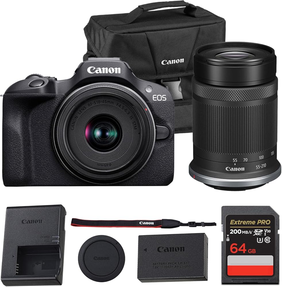 {"about_product": ["Canon USA Authorized. Items Include: Canon EOS R100 Mirrorless Camera Kit – APS-C RF Camera with 18-45mm & 55-210mm Lenses, 24MP Sensor, 4K Video & Dual Pixel AF, Canon EOS 200ES Shoulder Bag, 64GB Extreme PRO UHS-I SDXC Memory Card", "Perfect Entry to RF Mirrorless: The R100 offers great image quality in a compact form—perfect for beginners and hobbyists ready to step up from smartphones.", "Includes Two Versatile Zooms: This kit comes with the 18-45mm and 55-210mm lenses, covering everything from everyday scenes to distant subjects.", "Sharp 4K Video & Fast Autofocus: Record smooth, detailed video with fast, reliable Dual Pixel AF that tracks faces and subjects effortlessly.", "Lightweight, Ready to Travel: Designed for convenience and portability, this kit is ideal for travel, family photography, and everyday use."], "product_description": null, "product_information": {"ASIN": "B0FKCSCC6M", "Batteries": "1 Nonstandard Battery batteries required. (included)", "Item Weight": "3 pounds", "Manufacturer": "Canon", "Best Sellers Rank": "#6,820 in Electronics (See Top 100 in Electronics) #6 in Mirrorless Cameras", "Item model number": "6052C012", "Product Dimensions": "11 x 7 x 6 inches", "Date First Available": "July 29, 2025"}, "product_details": {"Brand": "Canon", "Model Name": "6052C022", "Aspect Ratio": "16:9", "Optical Zoom": "3 x", "Image Stabilization": "Optical, Digital", "Compatible Mountings": "Canon RF", "Maximum Focal Length": "210 Millimeters", "Supported File Format": "JPEG", "Photo Sensor Technology": "CMOS", "Maximum Webcam Image Resolution": "24.1 MP"}}