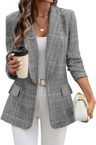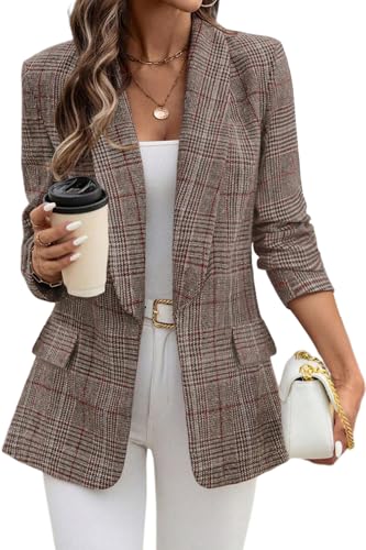 {"about_product": ["【Material】This women's blazer is made from soft fabric for a comfortable fit. Due to long-distance transportation, the blazer may arrive with slight wrinkles — simply iron on low heat if needed.", "【Features】Designed with an open front, shawl collar, and functional flap pockets, this blazer is both practical and convenient. The flattering cut and tailored silhouette add an elegant touch to your outfit.", "【Design】Featuring a classic plaid pattern, shawl collar, slim waistline, and practical side pockets, this blazer is elevated with a structured waist and padded shoulders to enhance a sophisticated, polished look.", "【Occasions】This business-casual blazer pairs effortlessly with different pants or skirts, making it suitable for formal events, office work, shopping, or everyday outings. Perfect for versatile styling in all seasons.", "【Tips & Care】Machine washable. Iron on low heat if necessary. Please refer to our “Size Chart” before ordering for the best fit."], "product_description": null, "product_information": {"ASIN": "B0FM3TPHLJ", "Department": "womens", "Customer Reviews": "4.5 4.5 out of 5 stars \n\n (40)", "Best Sellers Rank": "#80,274 in Clothing, Shoes & Jewelry (See Top 100 in Clothing, Shoes & Jewelry) #77 in Women's Blazers & Suit Jackets", "Date First Available": "August 12, 2025"}, "product_details": {"Origin": "Imported", "Fabric type": "Fabric:100%Polyester. Lining:100%Polyester", "Care instructions": "Machine Wash"}}