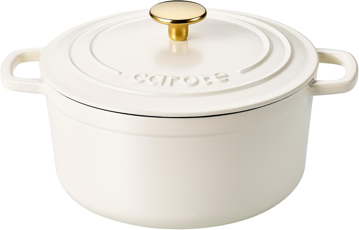 {"about_product": ["Enhanced Cooking Experience: Carote enameled cast iron Dutch oven delivers exceptional heat conduction and heat retention. Crafted from heavy-duty enameled cast iron and featuring a condensation design on the inner lid, it ensures a perfect cooking experience, locking in the flavors of your ingredients. Whether you're searing, roasting, or braising, the Carote enameled cast iron Dutch oven is your ultimate choice.", "Classic Design: Our round enameled cast iron Dutch oven comes with sturdy dual handles and a matching lid, designed with ergonomics in mind for easy transfer from stovetop to oven. Its stylish appearance adds a pop of color to your kitchen.", "Versatility: This premium Carote enameled cast iron Dutch oven is versatile enough for a wide range of cooking methods, including sautéing, searing, slow cooking, braising, stewing, boiling, frying, baking, and even grilling. It’s compatible with all stovetops, including gas, electric, ceramic, and induction. Plus, it’s oven-safe up to 500°F, giving you endless culinary possibilities.", "Super Easy to Clean: This enameled cast iron Dutch oven features a smooth, effortless-to-clean porcelain surface. With its naturally non-stick coating free of chemicals, it requires no seasoning—ready to use right away to deliver clean, delicious flavors. After cooking, simply wash with warm soapy water or a nylon brush for effective cleaning and extended durability.", "Service & Guarantee: We are committed to the quality of our enameled cast iron dutch oven. Each dutch oven undergoes multiple quality checks during production. Please don't hesitate to reach out if any quality problems arise. You'll be guaranteed to get a satisfying solution based on the specific situation."], "product_description": null, "product_information": {"ASIN": "B0FVFJ6SG6", "Brand": "CAROTE", "Color": "White", "Shape": "Round", "Capacity": "4 Quarts", "Material": "Cast Iron", "With Lid": "Yes", "Finish Type": "Enameled", "Item Weight": "12.29 pounds", "Is Oven Safe": "Yes", "Lid Material": "Cast Iron", "Manufacturer": "CAROTE", "Best Sellers Rank": "#1,626 in Kitchen & Dining (See Top 100 in Kitchen & Dining) #13 in Dutch Ovens", "Item model number": "A14394-new", "Is Dishwasher Safe": "No", "Product Dimensions": "9\"W x 4.3\"H", "Date First Available": "October 9, 2025", "Product Care Instructions": "Oven Safe"}, "product_details": {"Brand": "CAROTE", "Color": "White", "Capacity": "4 Quarts", "Material": "Cast Iron", "Finish Type": "Enameled"}}