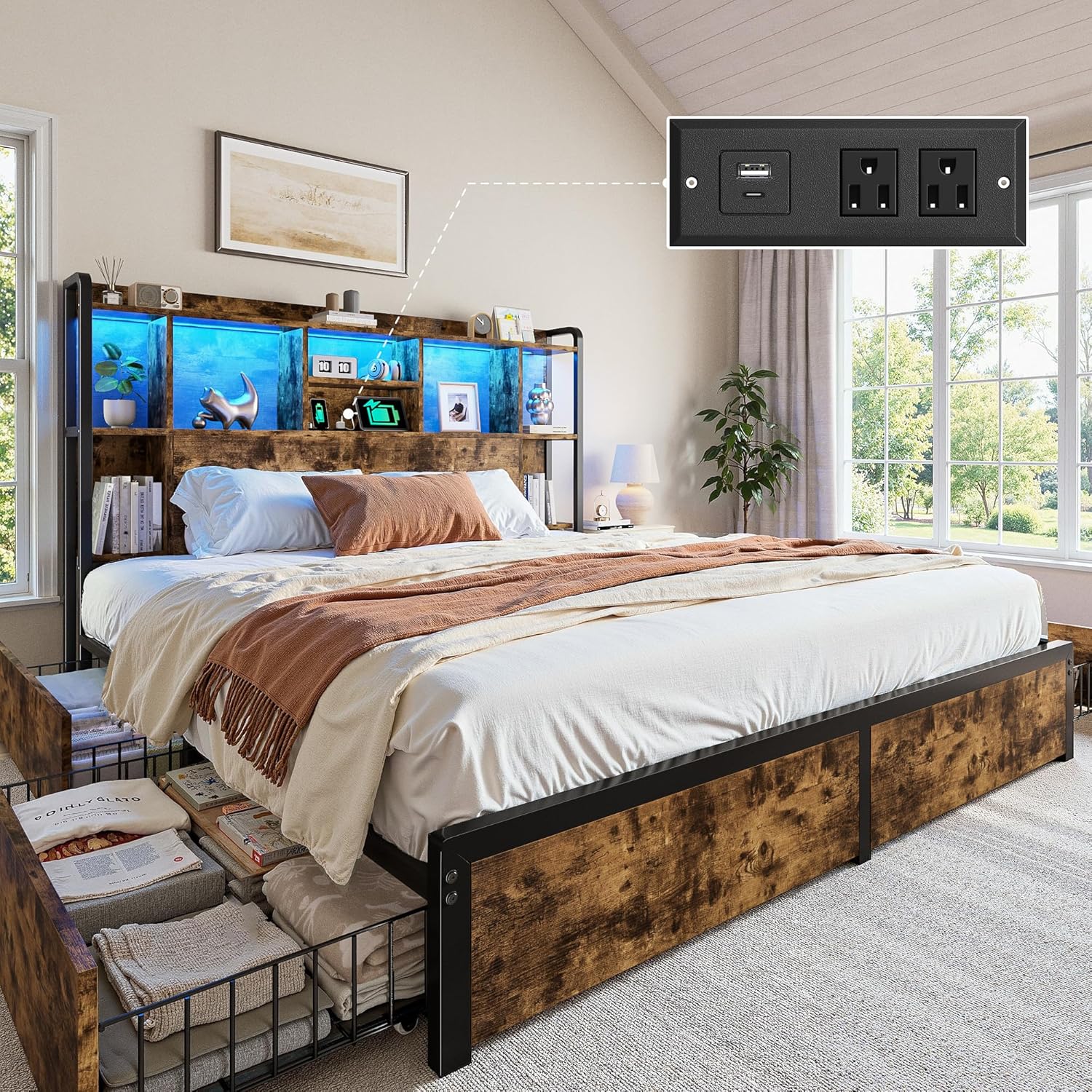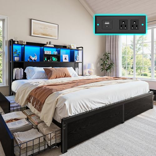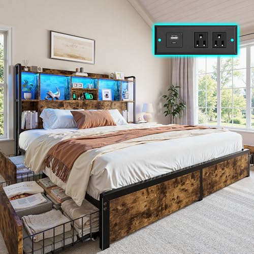 {"about_product": ["【Transform Your Bedroom into an Organized Sanctuary】:Say goodbye to bedroom clutter! This king bed frame and headboard is a storage powerhouse.The 51\" high headboard of king size bed frame features 9 spacious cubby compartments, ideal for books, decor, or essentials. 4 spacious, smooth-gliding drawers are tucked neatly below, offering ample discreet storage to maximize your bedroom space and reduce clutter.", "【Smart Charging & Ambient Lighting】:Designed for modern convenience, this king size bed frame with storage comes with a charging station and LED lighting into the headboard. Conveniently charge your devices and enjoy a cozy atmosphere for bedtime reading, eliminating the need to get out of bed.Metal bed frame king size integrates these features for a clean look.", "【Sturdy Construction & High Weight Capacity 】:Crafted from robust metal and wood, this king size bed frame with drawers delivers a weight capacity of 1200 lbs—ideal for supporting the family and bedroom essentials with unwavering stability. The reinforced slat system and multiple support legs of king bed frame and headboard ensure no sagging or shaking, offering a safe and steady foundation for daily use.", "【Silent Slat System & No Box Spring Needed】:Homkdom king bed frame with storage are equipped with noise-reducing fabric strips that minimize friction with the bed frame, creating a quiet environment from squeaks and shifts.The sturdy platform base of bed frame king size provides firm, stable support for you, promoting deeper, more restful sleep—all without needing a box spring.", "【Quick and Easy Assembly】:Putting together your new bed frame king size with headboard is straightforward, thanks to clearly labeled parts, pre-attached components, and simple instructions. All necessary tools are included for a easy setup.The king size bed will arrive in two separate boxes, which may not be delivered on the same day. No worries!"], "product_description": null, "product_information": {"ASIN": "B0G2WVHGRC", "Size": "King", "Brand": "Homkdom", "Color": "Vintage Brown", "Form Factor": "Rectangular with Tall Headboard and Storage", "Special Feature": "4 Drawer, Charging Station, Headboard, LED light, Storage Case", "Assembly Required": "Yes", "Best Sellers Rank": "#283,677 in Home & Kitchen (See Top 100 in Home & Kitchen) #1,108 in Bed Frames", "Headboard Material": "Wooden&Metal", "Product Dimensions": "87.9\"L x 75.9\"W x 51.2\"H", "Included Components": "Charging Station, Drawer, Headboard, LED light, Storage Case", "Date First Available": "November 19, 2025", "Compatible With Mattress Size": "King", "Assembly Instructions Description": "Easy to assemble with clear instructions and all necessary tools included."}, "product_details": {"Size": "King", "Style": "Modern", "Material": "Wooden&Metal", "Special Feature": "4 Drawer, Charging Station, Headboard, LED light, Storage Case", "Product Dimensions": "87.9"L x 75.9"W x 51.2"H"}}